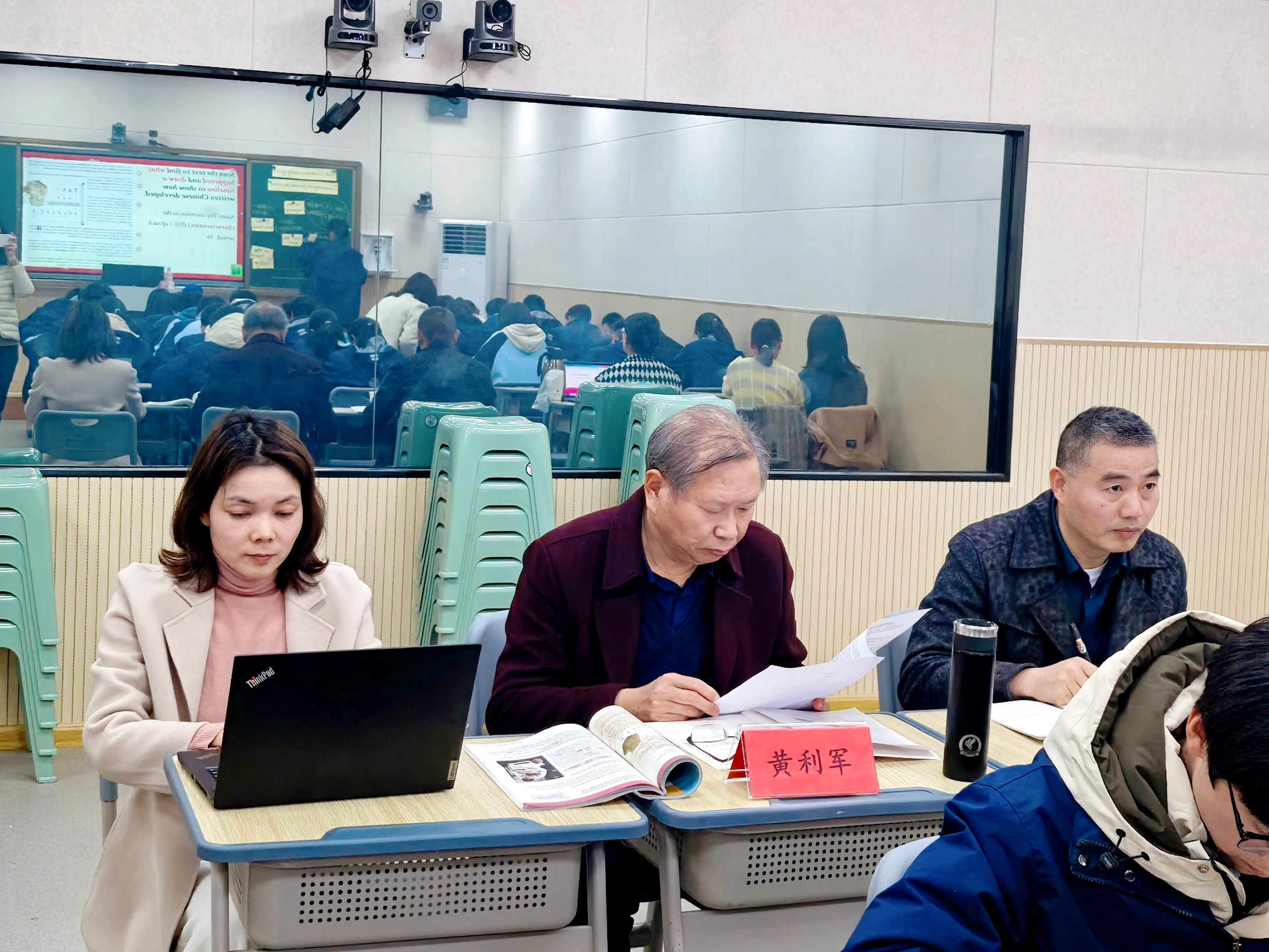 郑州市教育教学研究室英语教研员黄利军老师(中)认真听课